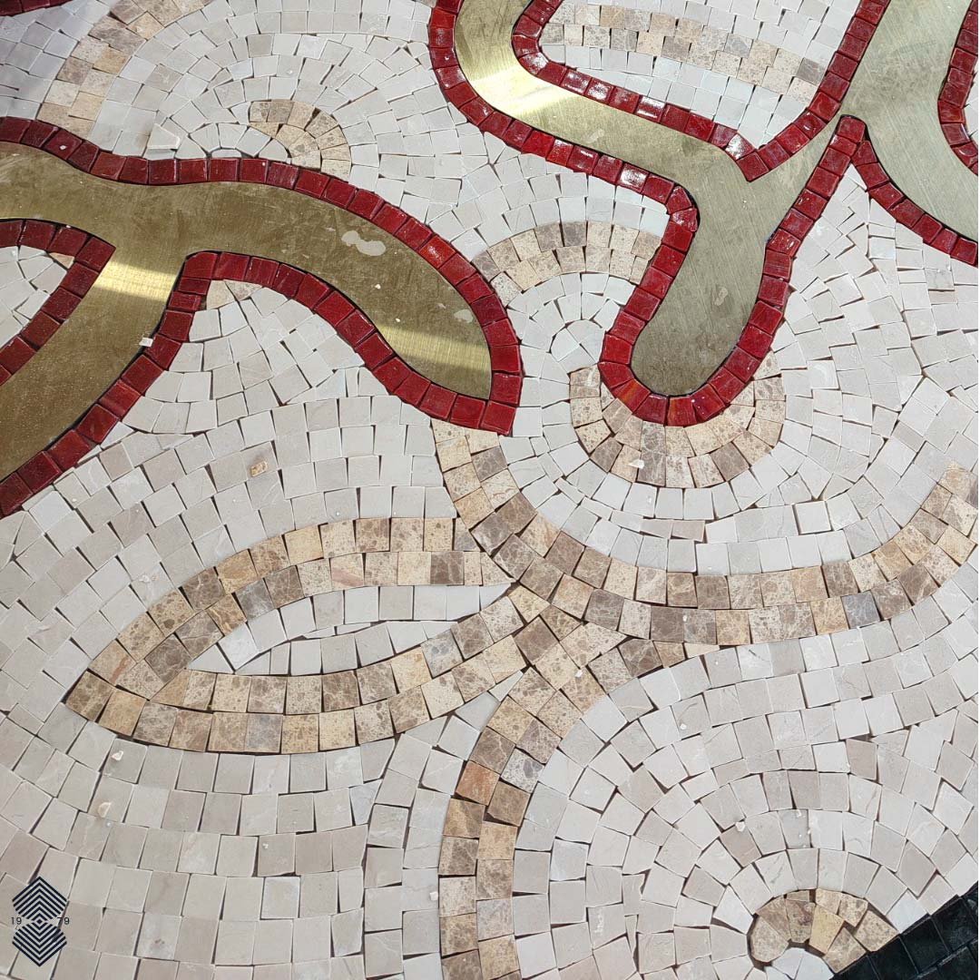 At MEC Studio, the design began with the ground itself as the primary emotional vehicle. Warm, light-toned tesserae—off-white, cream, pale beige, and soft browns—were arranged in subtle swirling and radiating patterns. This foundation introduces softness and motion without competing with the layered symbols, allowing the composition to breathe.