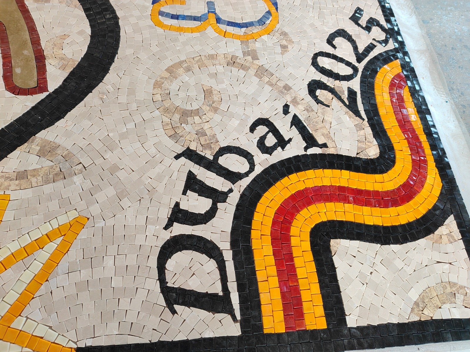 Black lines provide structural weight, and small touches of yellow and ochre punctuate the surface, activating forms without overwhelming them. Against the matte stone, the glossy tesserae articulate a clear distinction between figure and ground, atmosphere and signal, reinforcing both materiality and conceptual intent.