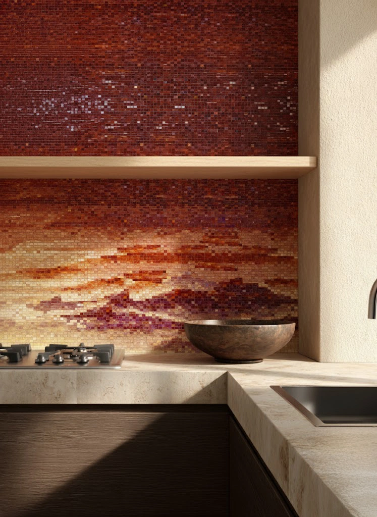 - Multi-tonal arrangement of red, amber, and gold glass tiles