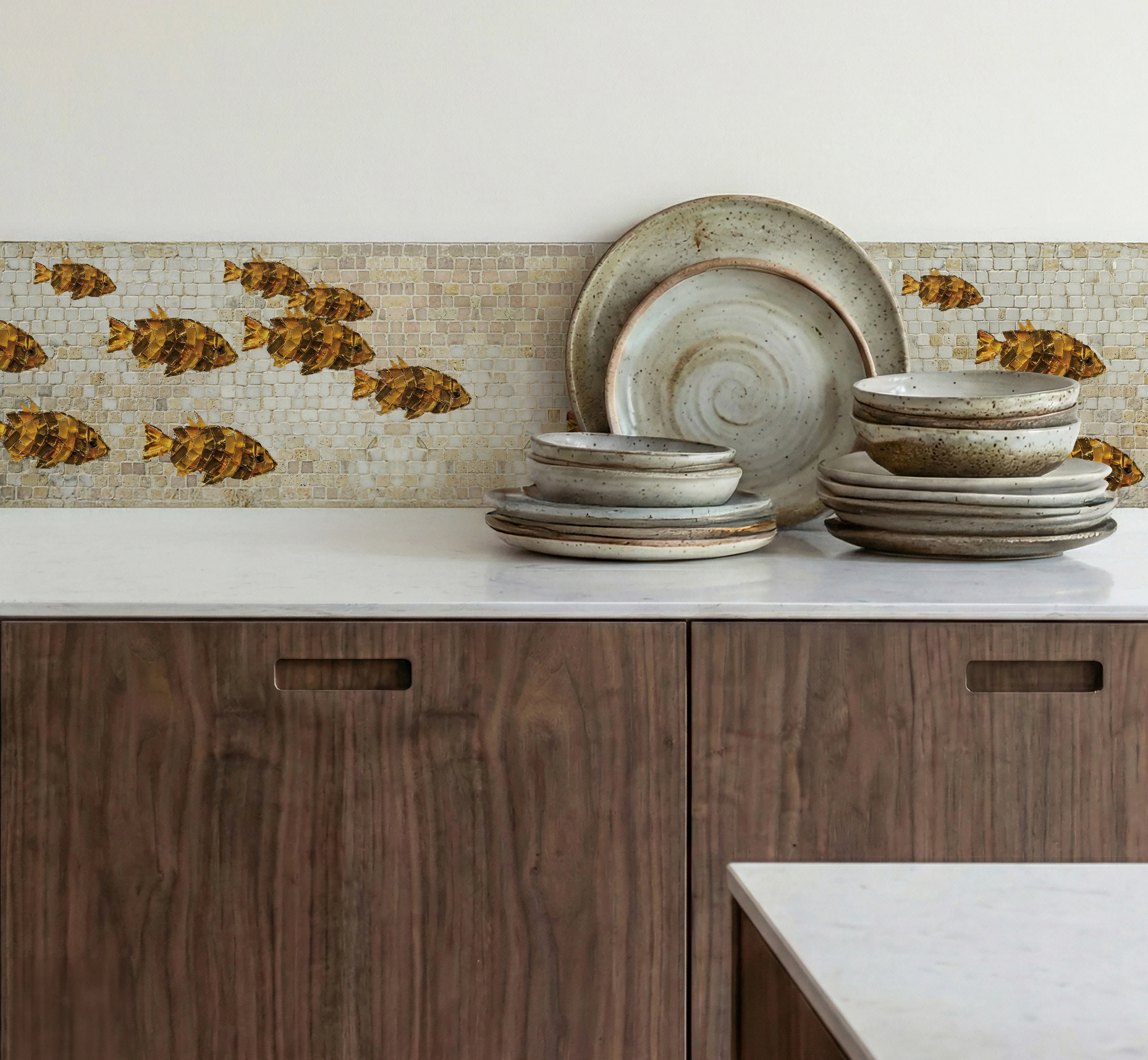 Each fish is rendered in rich golden and honey-toned tesserae, adding depth, shimmer, and subtle dimensionality. The neutral mosaic base enhances contrast while maintaining versatility, allowing the design to integrate seamlessly into modern kitchens, dining spaces, or coastal-inspired interiors.