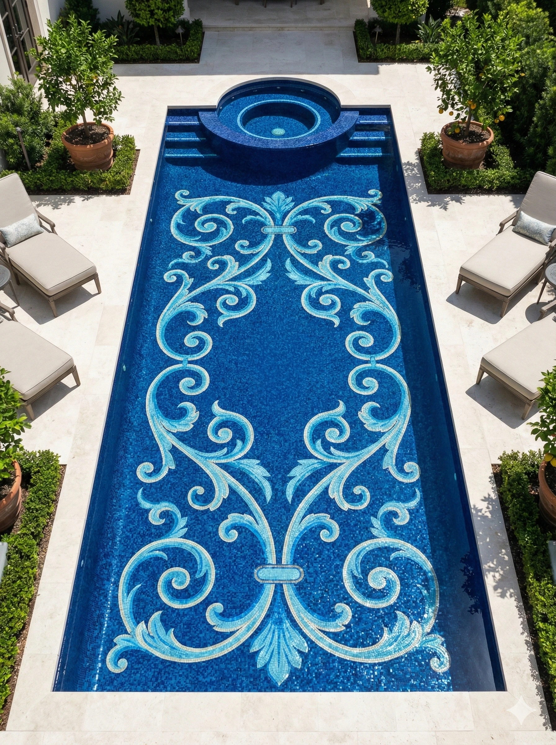 - This pool features refined mosaic craftsmanship with large-scale, symmetrical arabesque scrollwork executed in fine tesserae.