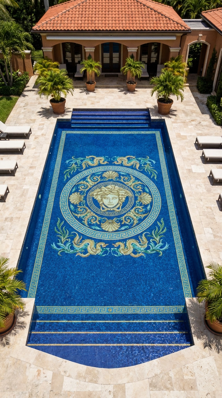 - This pool floor mosaic reflects premium craftsmanship with a centered medallion composition executed in fine tesserae.