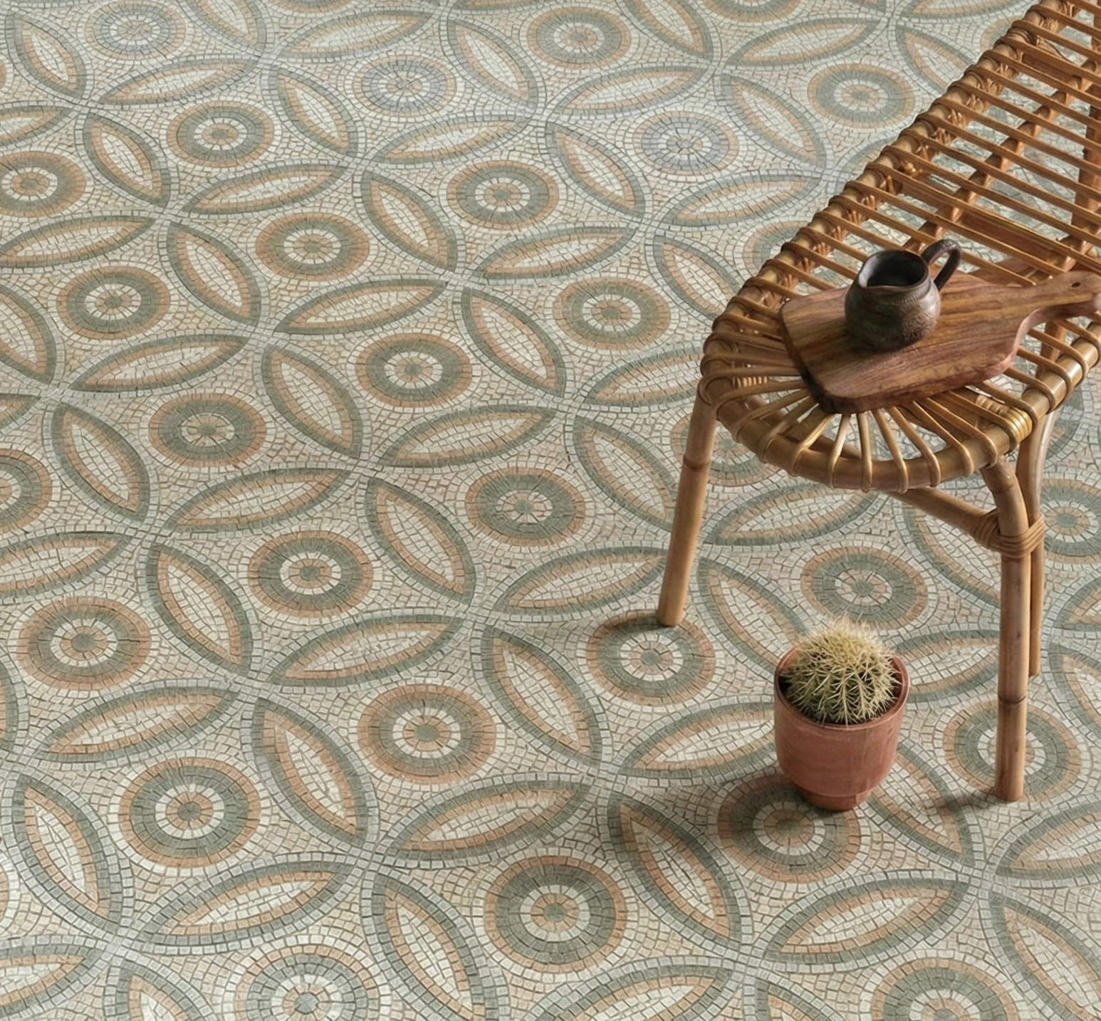 The Botanical Geometric Mosaic Floor presents a harmonious blend of geometry and organic inspiration, where circular medallions and elongated petal forms interlock seamlessly across the surface. The design creates a rhythmic pattern that feels both structured and fluid, echoing natural floral arrangements through precise geometric repetition.