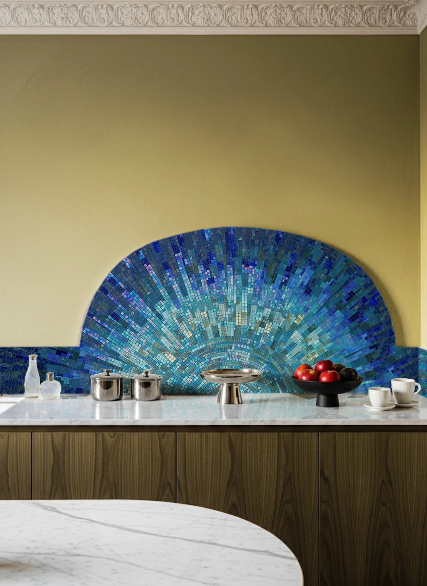 Finished in bespoke dimensions and tailored tones, this mosaic is crafted to reflect oceanic brilliance and elevate vibrant, light-filled living spaces.