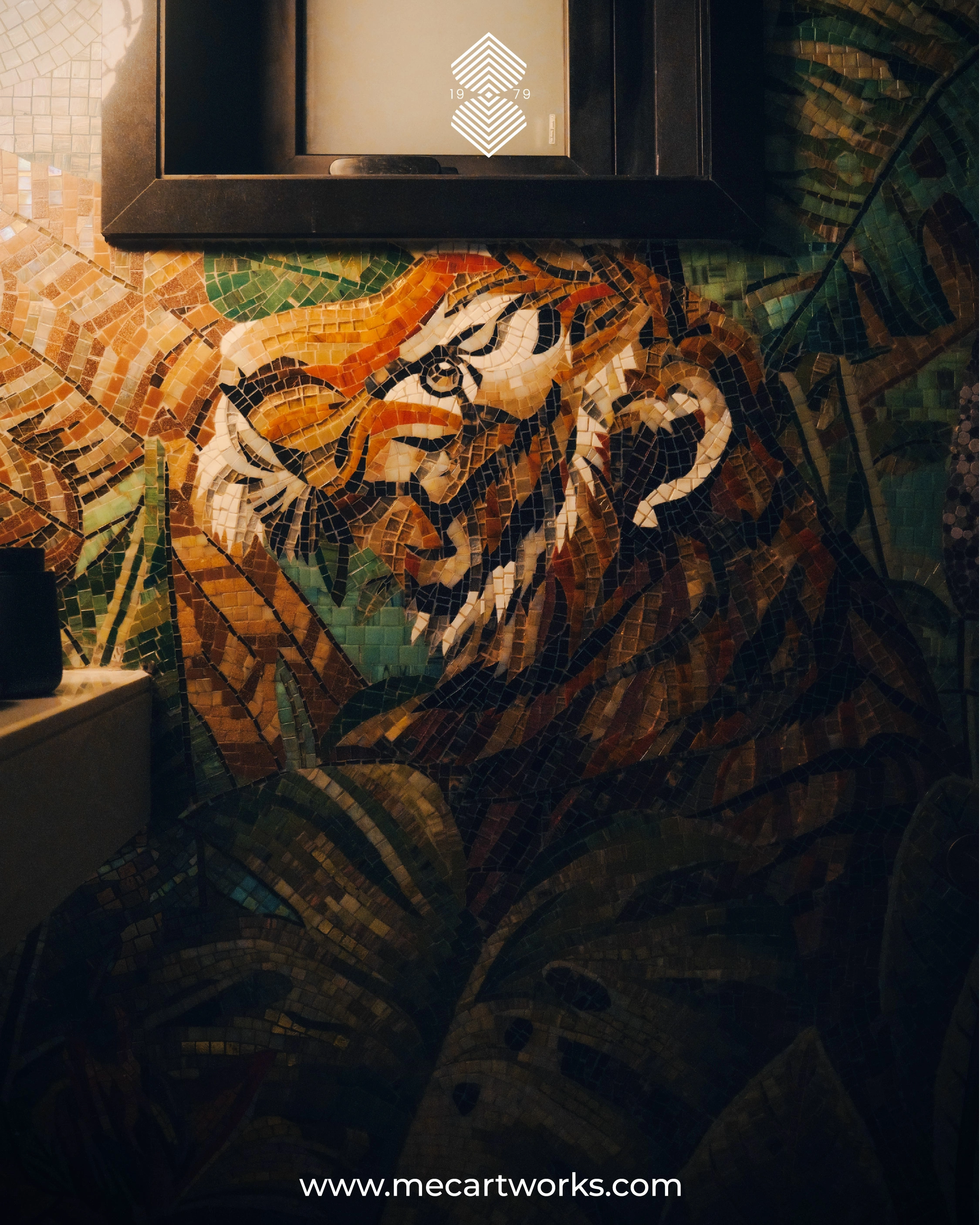 Rendered in rich tones of amber, burnt orange, deep brown, and ivory, the tiger’s form is defined through intricate tesserae placement that mirrors the natural flow of its stripes. Each detail contributes to a sense of depth and realism, giving the mural a lifelike presence within the space.
