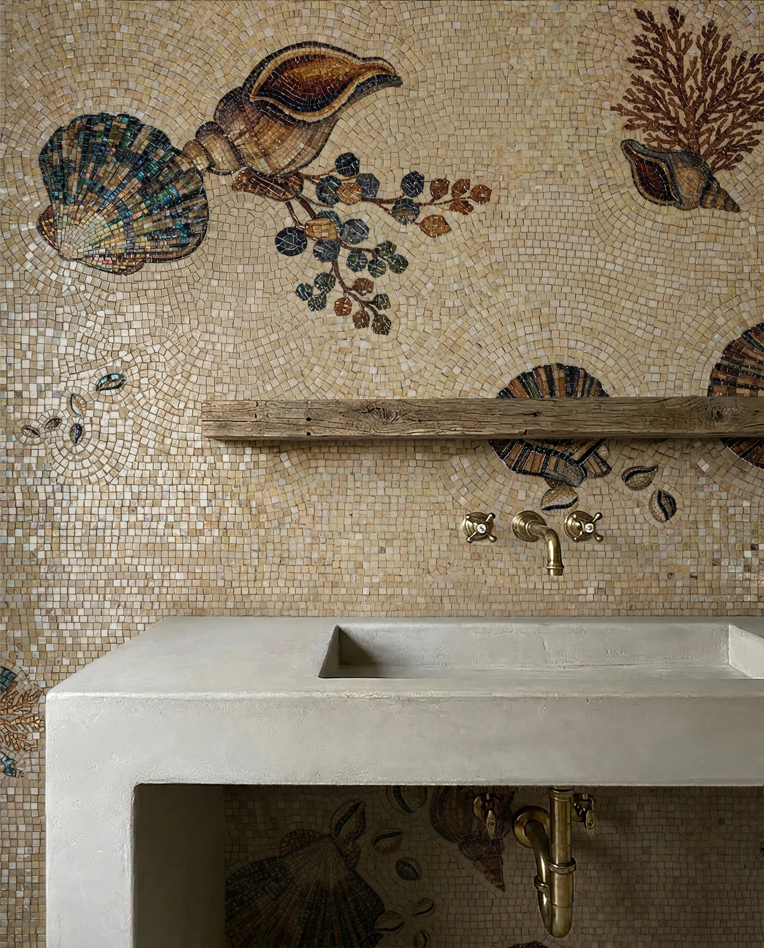 Designed for sophisticated bathrooms and curated coastal interiors, this bespoke shell mosaic delivers timeless marine charm with artisanal refinement.