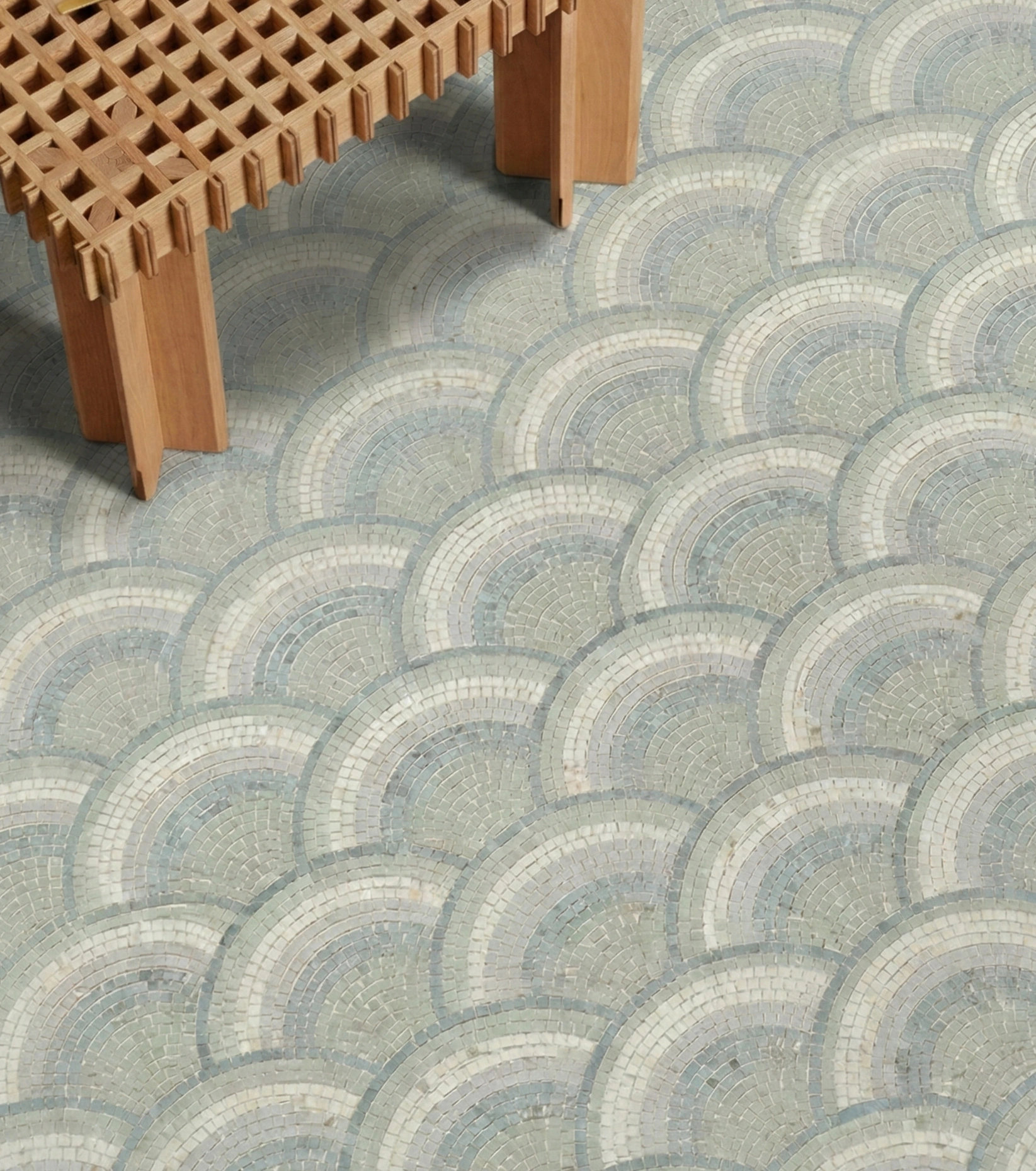 The Pastel Wave Mosaic Floor introduces a gentle rhythm of overlapping curves, creating a soft, flowing pattern that evokes calm and subtle movement. Inspired by natural forms and quiet landscapes, the design unfolds through layered arc motifs that resemble ripples or rising mist.
