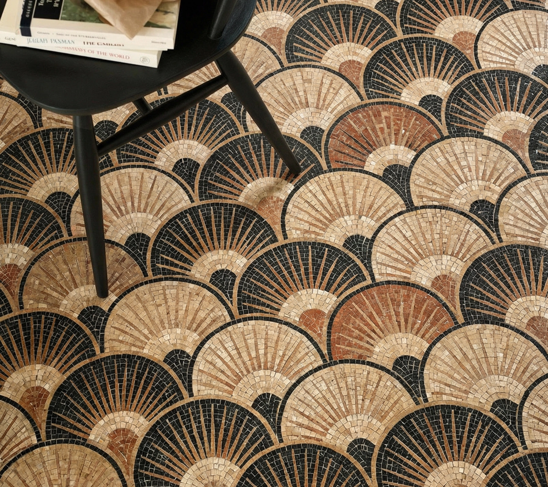 The Radiant Arc Heritage Mosaic Floor is a bold interpretation of classic Art Deco geometry, defined by its repeating fan-shaped arcs that radiate outward in rhythmic precision. Each segment forms a layered composition of curved lines, creating a dynamic sense of movement across the surface.