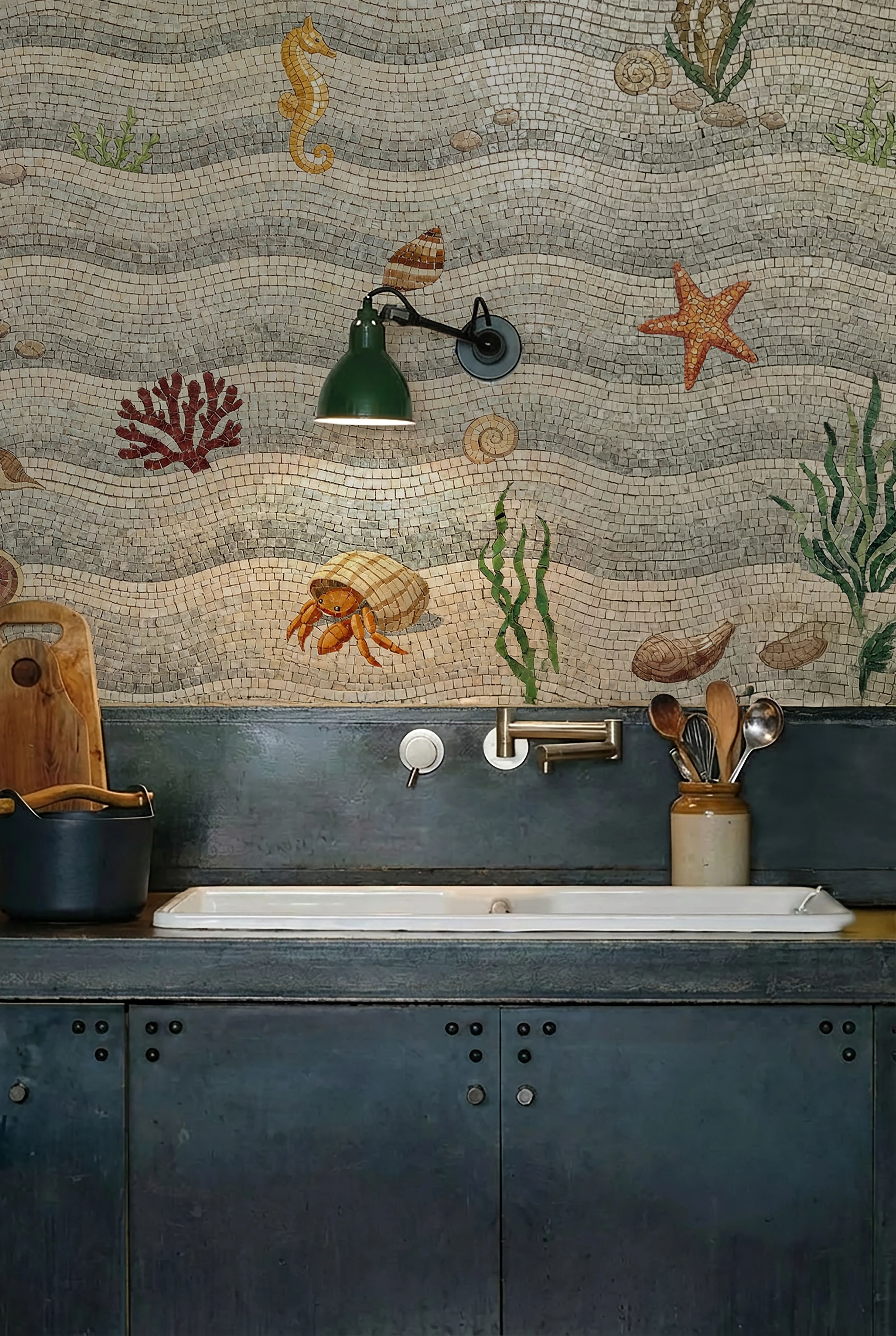 Perfect for bespoke bathrooms and coastal-inspired interiors, this handcrafted ocean mosaic infuses spaces with playful elegance and timeless artisanal charm.