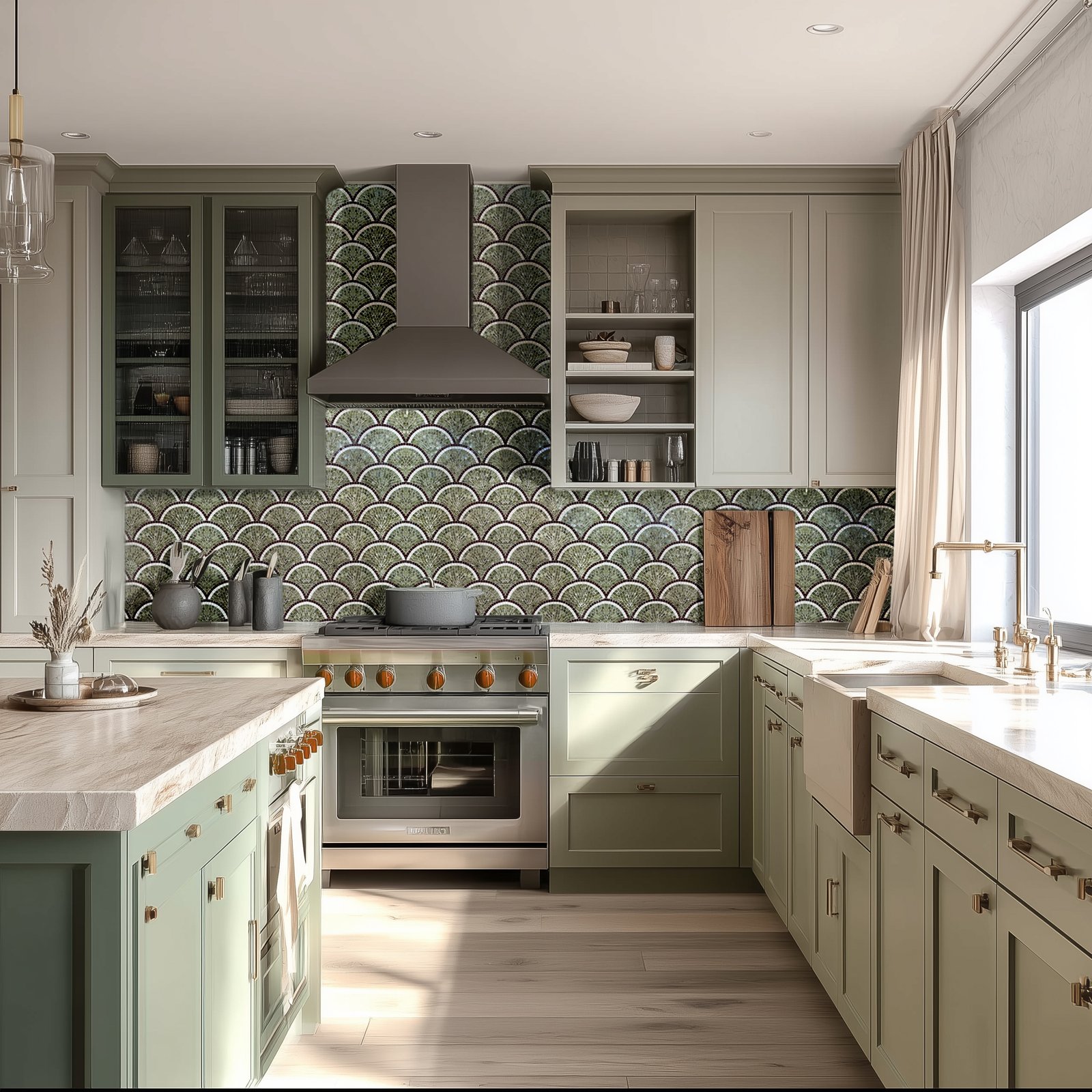 - Artistic layering that enhances rhythm and texture across the backsplash